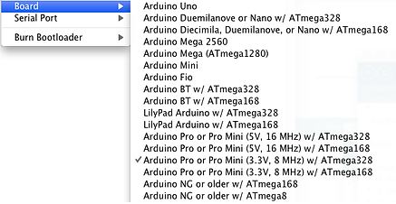 Tools > Board > Arduino Pro or Pro Mini(3.3V, 8 MHz)w/ATmega328.